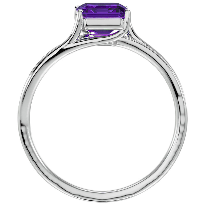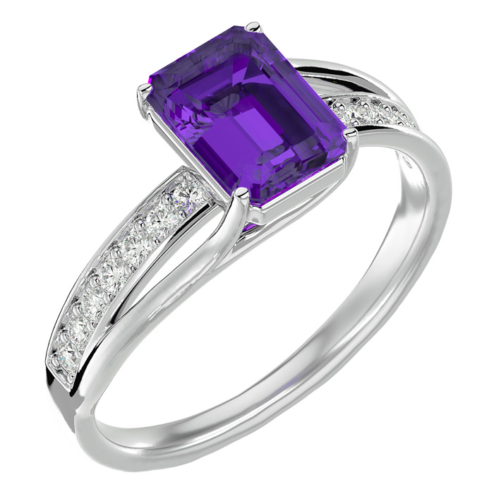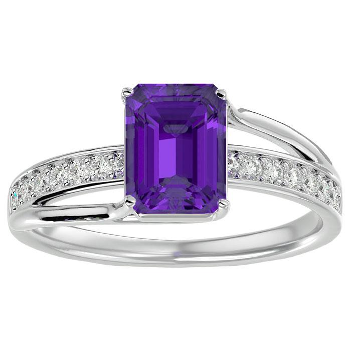 This amethyst ring features one 8x6mm emerald shape amethyst gemstone. It is surrounded by 14 sparkling diamonds totaling 1/5 carat in I-J color, I1-I2 clarity. Total carat weight is approximately 1 3/4 carats. This ring is in sterling silver.
