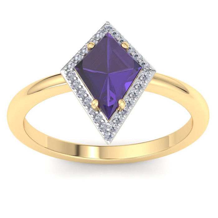 This gemstone ring features one 10x7mm kite shape amethyst gemstone weighing approximately 1 1/2 carats. There are 26 sparkling diamonds in I-J color, I1-I2 clarity totaling approximately 1/4 carat. Total carat weight is 1 3/4 carats. This ring is in 14 karat yellow gold.