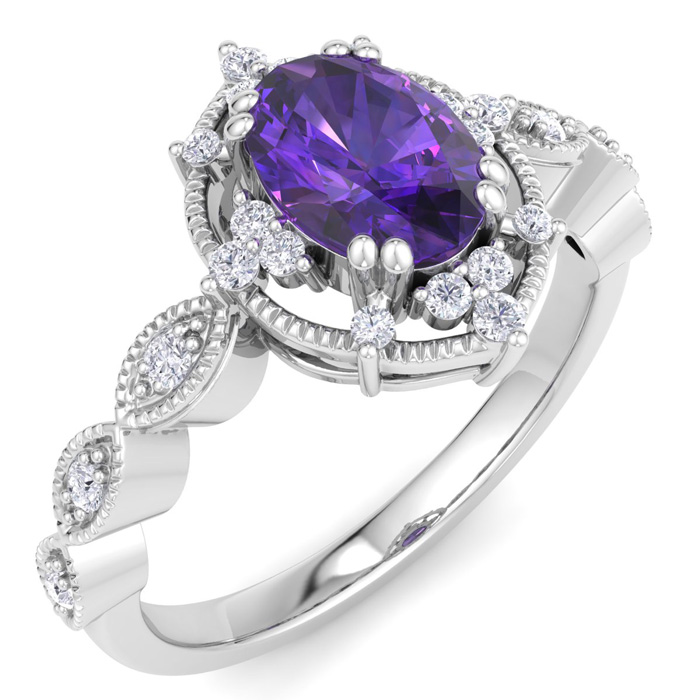 This gemstone ring features one 7x5mm oval shape amethyst gemstone weighing approximately 3/4 carat. There are 22 sparkling round diamonds in I-J color, I1-I2 clarity totaling approximately 1/4 carat. Total carat weight is 1 carat. This ring is in 14 karat white gold.