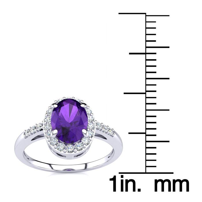 This amethyst ring features one 7x5mm oval shape amethyst gemstone. It is surrounded by 24 sparkling diamonds totaling 1/8 carat in I-J color, I1-I2 clarity. Total carat weight is approximately 1.12 carats. This ring is in sterling silver.