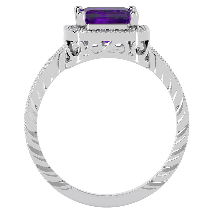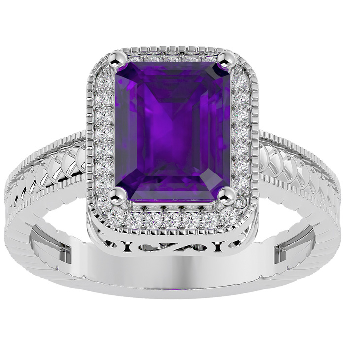 This amethyst ring features one 9x7mm emerald shape amethyst gemstone. It is surrounded by 38 sparkling diamonds totaling 1/5 carat in I-J color, I1-I2 clarity. Total carat weight is approximately 2 3/4 carats. This ring is in sterling silver.