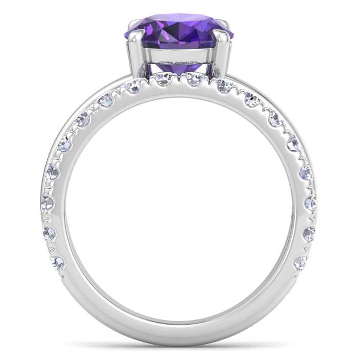 This elegant gemstone ring features one 10x8mm oval shape amethyst gemstone at approximately 2 1/3 carats. It is surrounded by 18 sparkling diamonds in I-J color, I1-I2 clarity at 1/2 carat total weight. Total gem weight is approximately 2 3/4 carats. This ring is in 14 karat white gold.
