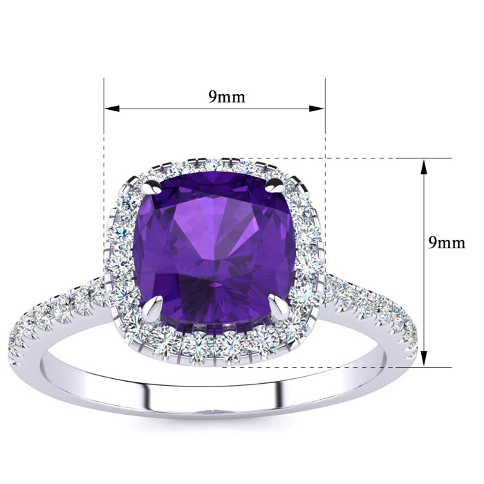 This amethyst ring features one 7mm cushion cut amethyst gemstone. It is surrounded by 38 sparkling diamonds totaling 1/2 carat in I-J color, I1-I2 clarity. Total carat weight is approximately 2 carats. This ring is in sterling silver.