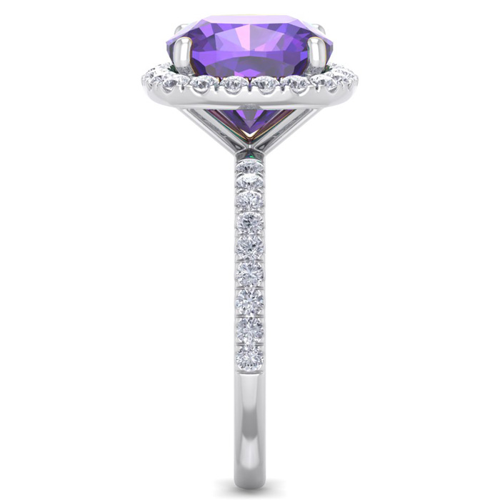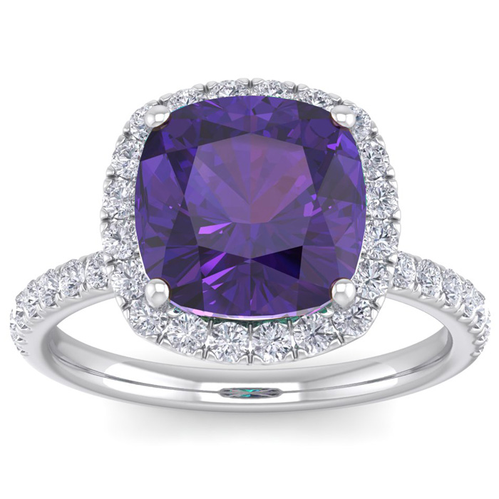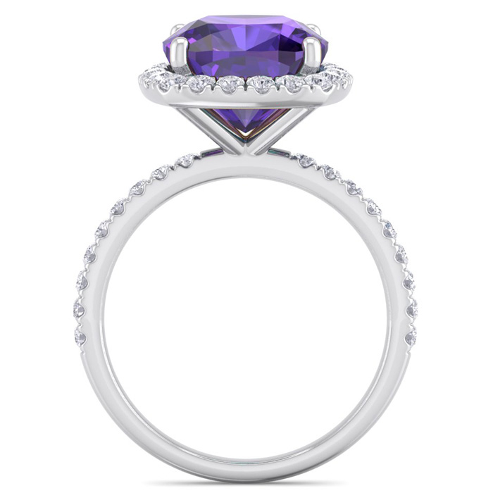 This amethyst ring features one 10mm cushion cut amethyst gemstone. It is surrounded by 38 sparkling diamonds totaling 1/2 carat in I-J color, I1-I2 clarity. Total carat weight is approximately 5 1/2 carats. This ring is in sterling silver. *Retrograde Birthstones™ flips the idea of traditional birthstones. Wear your ½ birthday birthstone, your Retrograde Birthstone, “The Birthstone For Your Bad Side™.