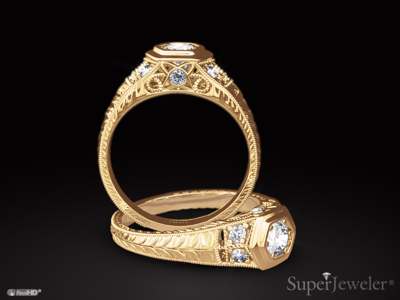 This antique diamond engagement ring features a gorgeous 0.25 carat center diamond. It is in a 6-prong setting surrounded by micropave diamonds along the band. Total diamond weight is 0.30 carats in H-I color, SI2-I1 clarity. The ring contains 7 diamonds total and is crafted in 14 karat yellow gold.