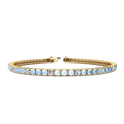 This classic gemstone bracelet features shimmering white diamonds in J-K color, I1-I2 clarity and aquamarine gemstones. The 6 inch bracelet contains 57 gemstones and diamonds at 2.28 carats. The 6.5 inch bracelet contains 62 gemstones and diamonds at 2.48 carats. The 7 inch bracelet contains 67 gemstones and diamonds at 2.68 carats. The 7.5 inch bracelet contains 72 gemstones and diamonds at 2.88 carats. The 8 inch bracelet contains 76 gemstones and diamonds at 3.04 carats. The 8.5 inch bracelet contains 81 gemstones and diamonds at 3.24 carats. The 9 inch bracelet contains 86 gemstones and diamonds at 3.44 carats. This bracelet is approximately 2.25mm wide and is crafted in 14 karat yellow gold. This bracelet has a secure, box with tongue and safety clasp.