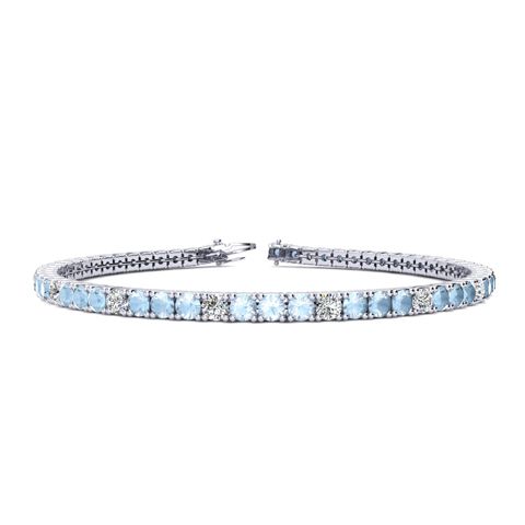 This classic gemstone bracelet features shimmering white diamonds in J-K color, I1-I2 clarity and aquamarine gemstones. The 6 inch bracelet contains 57 gemstones and diamonds at 2.28 carats. The 6.5 inch bracelet contains 62 gemstones and diamonds at 2.48 carats. The 7 inch bracelet contains 67 gemstones and diamonds at 2.68 carats. The 7.5 inch bracelet contains 72 gemstones and diamonds at 2.88 carats. The 8 inch bracelet contains 76 gemstones and diamonds at 3.04 carats. The 8.5 inch bracelet contains 81 gemstones and diamonds at 3.24 carats. The 9 inch bracelet contains 86 gemstones and diamonds at 3.44 carats. This bracelet is approximately 2.25mm wide and is crafted in 14 karat white gold. This bracelet has a secure, box with tongue and safety clasp.