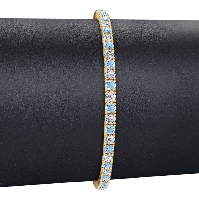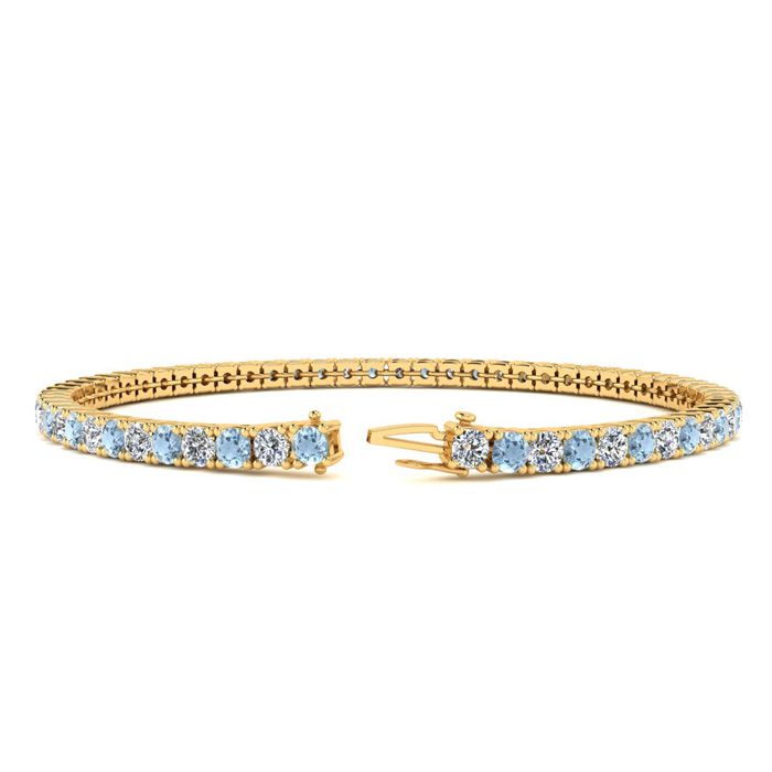 This classic gemstone bracelet features shimmering white diamonds in J-K color, I1-I2 clarity and aquamarine gemstones. The 6 inch bracelet contains 57 gemstones and diamonds at 2.28 carats. The 6.5 inch bracelet contains 62 gemstones and diamonds at 2.48 carats. The 7 inch bracelet contains 67 gemstones and diamonds at 2.68 carats. The 7.5 inch bracelet contains 72 gemstones and diamonds at 2.88 carats. The 8 inch bracelet contains 76 gemstones and diamonds at 3.04 carats. The 8.5 inch bracelet contains 81 gemstones and diamonds at 3.24 carats. The 9 inch bracelet contains 86 gemstones and diamonds at 3.44 carats. This bracelet is approximately 2.25mm wide and is crafted in 14 karat yellow gold. This bracelet has a secure, box with tongue and safety clasp.