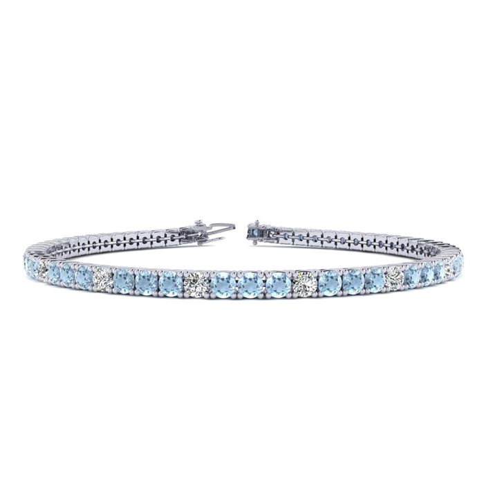 This classic gemstone bracelet features shimmering white diamonds in J-K color, I1-I2 clarity and aquamarine gemstones. The 6 inch bracelet contains 57 gemstones and diamonds at 2.28 carats. The 6.5 inch bracelet contains 62 gemstones and diamonds at 2.48 carats. The 7 inch bracelet contains 67 gemstones and diamonds at 2.68 carats. The 7.5 inch bracelet contains 72 gemstones and diamonds at 2.88 carats. The 8 inch bracelet contains 76 gemstones and diamonds at 3.04 carats. The 8.5 inch bracelet contains 81 gemstones and diamonds at 3.24 carats. The 9 inch bracelet contains 86 gemstones and diamonds at 3.44 carats. This bracelet is approximately 2.25mm wide and is crafted in 14 karat white gold. This bracelet has a secure, box with tongue and safety clasp.