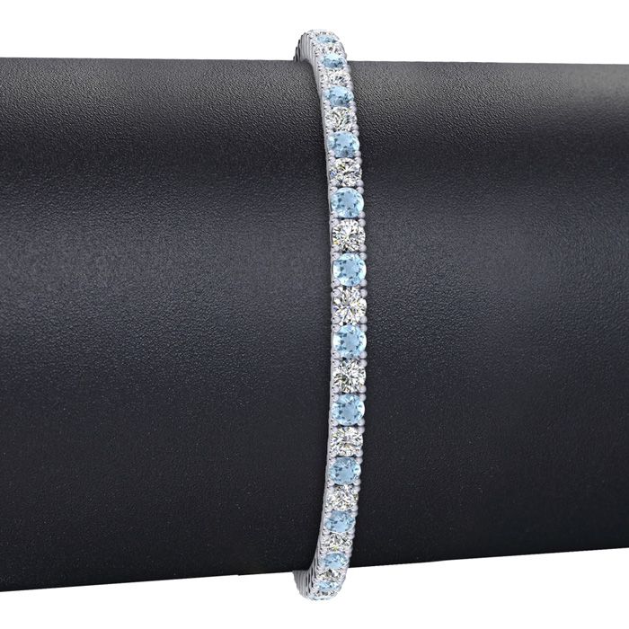 This classic gemstone bracelet features shimmering white diamonds in J-K color, I1-I2 clarity and aquamarine gemstones. The 6 inch bracelet contains 57 gemstones and diamonds at 2.28 carats. The 6.5 inch bracelet contains 62 gemstones and diamonds at 2.48 carats. The 7 inch bracelet contains 67 gemstones and diamonds at 2.68 carats. The 7.5 inch bracelet contains 72 gemstones and diamonds at 2.88 carats. The 8 inch bracelet contains 76 gemstones and diamonds at 3.04 carats. The 8.5 inch bracelet contains 81 gemstones and diamonds at 3.24 carats. The 9 inch bracelet contains 86 gemstones and diamonds at 3.44 carats. This bracelet is approximately 2.25mm wide and is crafted in 14 karat white gold. This bracelet has a secure, box with tongue and safety clasp.