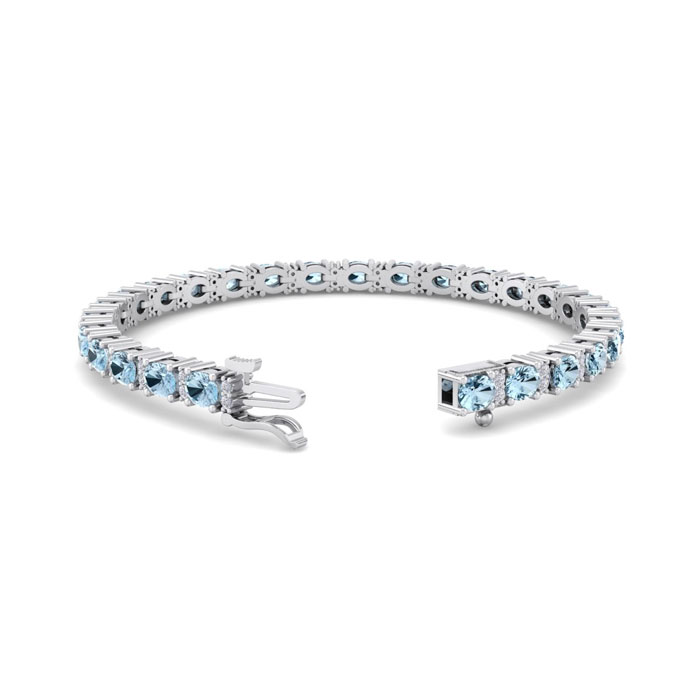 This gemstone bracelet features 26 oval shape 4x3mm aquamarine gemstones totaling approximately 4 1/2 carats. There are 52 round shape diamonds in I-J color, I2 clarity totaling approximately 1/2 carat. Total carat weight is 5 carats. This gemstone bracelet is in 14 karat white gold and is 7 inches long. It comes with a secure box with tongue and safety clasp.