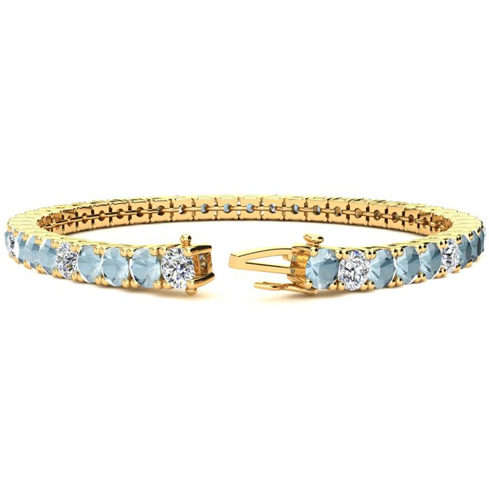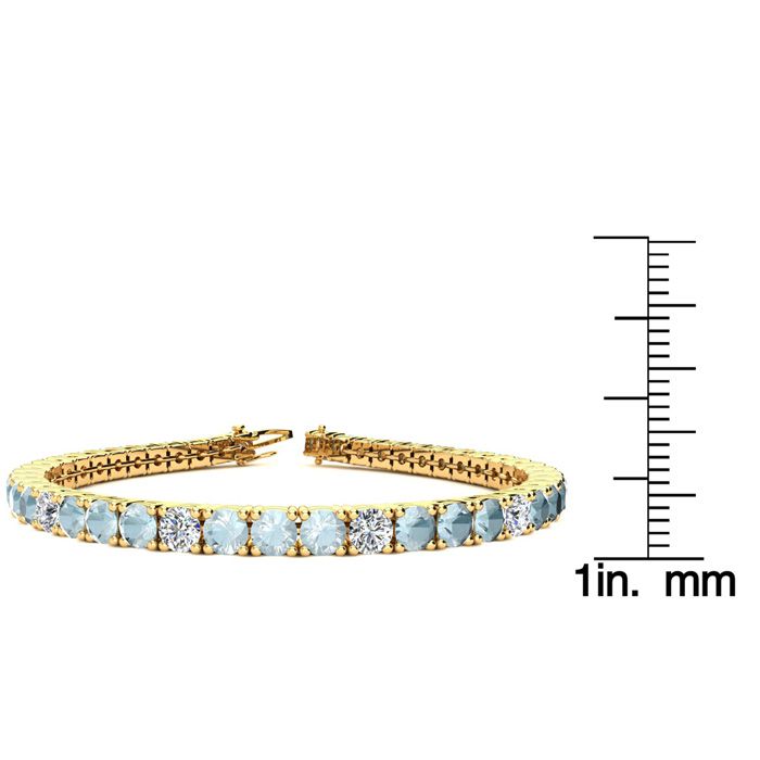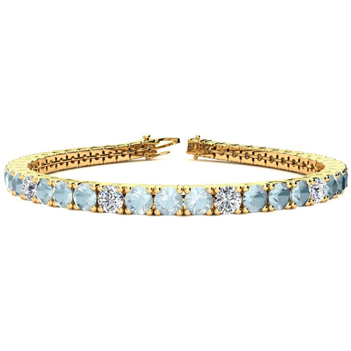 This classic gemstone bracelet features shimmering white diamonds in I-J color, I1-I2 clarity and aquamarine gemstones. The 6 inch bracelet contains 39 gemstones and diamonds at 6.60 carats. The 6.5 inch bracelet contains 42 gemstones and diamonds at 7.28 carats. The 7 inch bracelet contains 45 gemstones and diamonds at 7.80 carats. The 7.5 inch bracelet contains 49 gemstones and diamonds at 8.32 carats. The 8 inch bracelet contains 53 gemstones and diamonds at 9 carats. The 8.5 inch bracelet contains 56 gemstones and diamonds at 9.52 carats. The 9 inch bracelet contains 59 gemstones and diamonds at 10 carats. This bracelet is approximately 3.8mm wide and is crafted in 14 karat yellow gold. This bracelet has a secure, box with tongue and safety clasp.