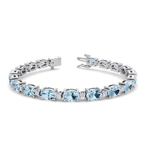 This gemstone bracelet features 19 oval shape 6x4mm aquamarine gemstones totaling approximately 8 1/2 carats. There are 19 round shape diamonds in I-J color, I2 clarity totaling approximately 0.40 carats. Total carat weight is 9 carats. This gemstone bracelet is in 14 karat white gold and is 7 inches long. It comes with a secure box with tongue and safety clasp.