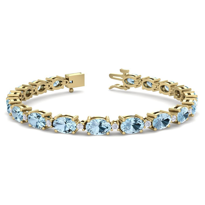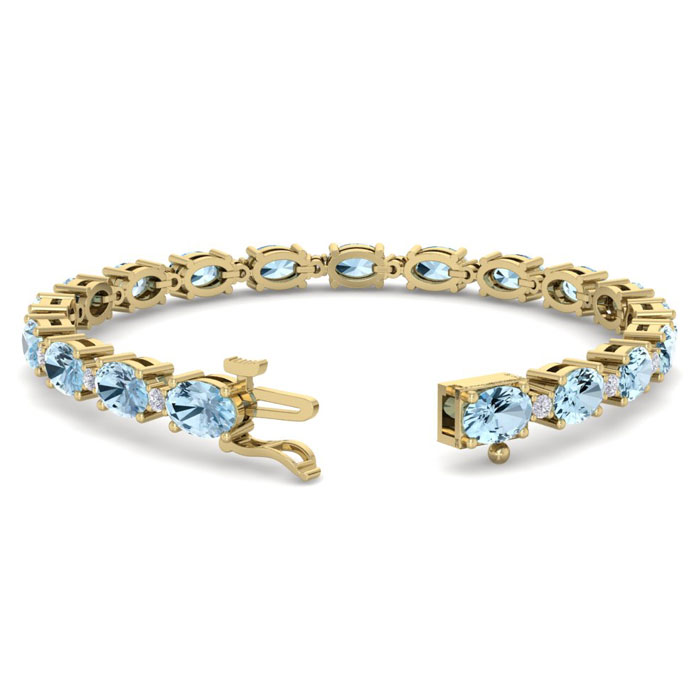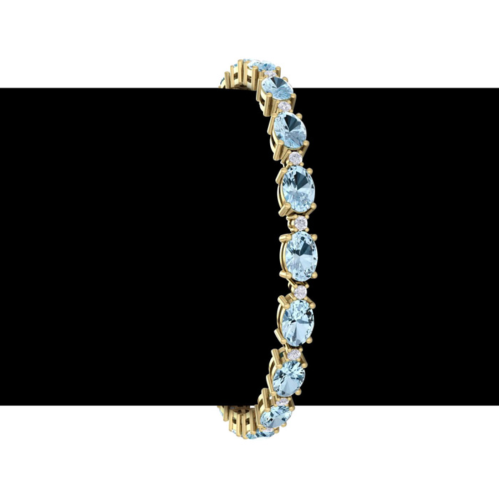 This gemstone bracelet features 19 oval shape 6x4mm aquamarine gemstones totaling approximately 8 1/2 carats. There are 19 round shape diamonds in I-J color, I2 clarity totaling approximately 0.40 carats. Total carat weight is 9 carats. This gemstone bracelet is in 14 karat yellow gold and is 7 inches long. It comes with a secure box with tongue and safety clasp.