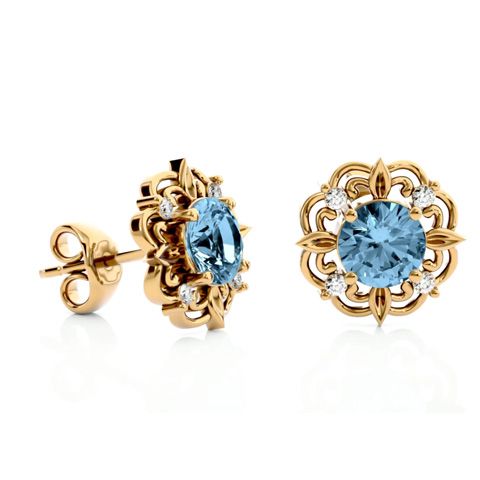 These elegant gemstone earrings feature two 6mm aquamarine gemstones at approximately 1 1/2 carats. They are surrounded by 8 sparkling diamonds in I-J color, I1-I2 clarity at 1/10 carat total weight. Total gem weight is approximately 1.60 carats. These earrings are in 14 karat yellow gold and have comfortable and secure friction backs.