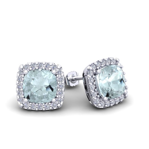 These stunning gemstone and halo diamond earrings feature two 6x6mm cushion cut aquamarine gemstones at 1.44 carats. The gemstones are surrounded by 44 sparkling diamonds in a halo in I-J color, SI2-I1 clarity at 0.22 carats. Total gem weight is 1.66 carats. These earrings are crafted in 14 karat white gold and come with comfortable and secure post with friction backs.