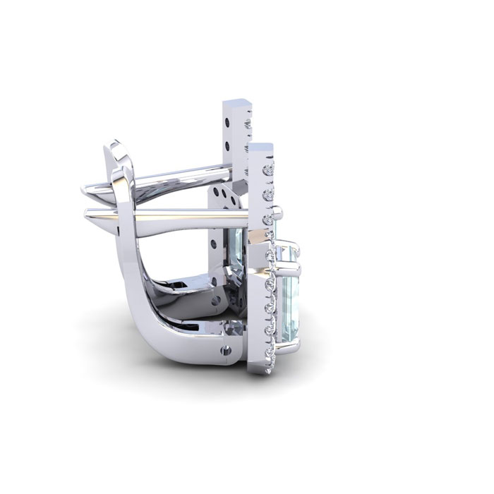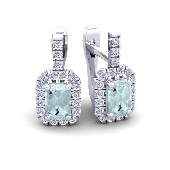 These stunning gemstone and halo diamond earrings feature two 6x4mm emerald cut aquamarine gemstones at 1.20 carats. The gemstones are surrounded by 38 sparkling diamonds in a halo in I-J color, SI2-I1 clarity at 0.48 carats. Total gem weight is 1.68 carats. These earrings are crafted in 14 karat white gold and come with comfortable and secure snap backs.