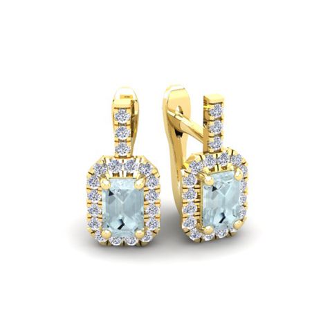 These stunning gemstone and halo diamond earrings feature two 6x4mm emerald cut aquamarine gemstones at 1.20 carats. The gemstones are surrounded by 38 sparkling diamonds in a halo in I-J color, SI2-I1 clarity at 0.48 carats. Total gem weight is 1.68 carats. These earrings are crafted in 14 karat yellow gold and come with comfortable and secure snap backs.