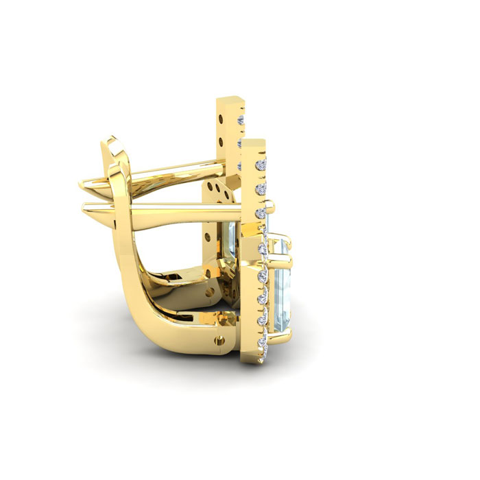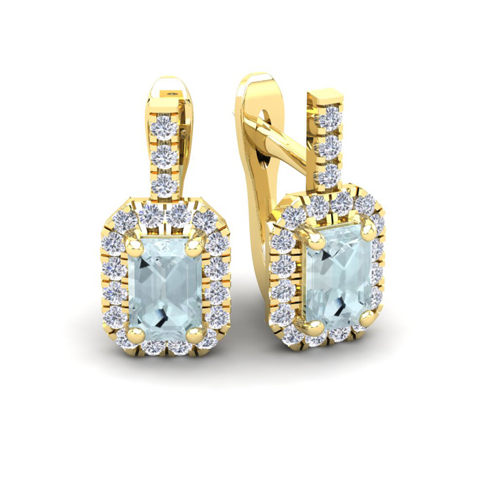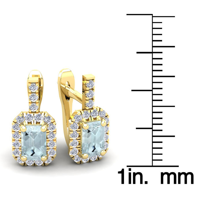 These stunning gemstone and halo diamond earrings feature two 6x4mm emerald cut aquamarine gemstones at 1.20 carats. The gemstones are surrounded by 38 sparkling diamonds in a halo in I-J color, SI2-I1 clarity at 0.48 carats. Total gem weight is 1.68 carats. These earrings are crafted in 14 karat yellow gold and come with comfortable and secure snap backs.
