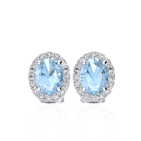 1 3/4 Carat Oval Shape Aquamarine and Halo Diamond Stud Earrings In 14 Karat White Gold