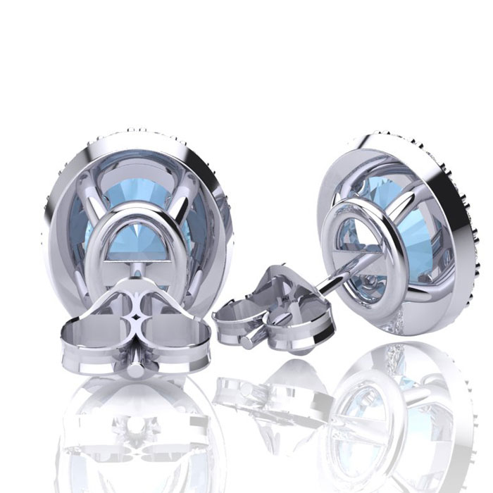 These stunning gemstone and halo diamond earrings features two 7x5mm oval shape aquamarine gemstones at 1.60 carats. They are surrounded by 40 sparkling diamonds in I-J color, I1-I2 clarity at 0.20 carats. Total gem weight is 1.80 carats. These earrings are crafted in 14 karat white gold and have comfortable and secure post with friction backs.