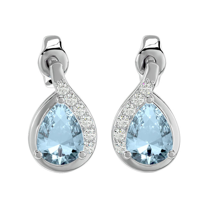 These elegant gemstone earrings feature two 7x5mm pear shape aquamarine gemstones at approximately 1 1/3 carats. They are surrounded by 12 sparkling diamonds in I-J color, I1-I2 clarity at 1/10 carat total weight. Total gem weight is approximately 1.40 carats. These earrings are in 14 karat white gold and have comfortable and secure friction backs.