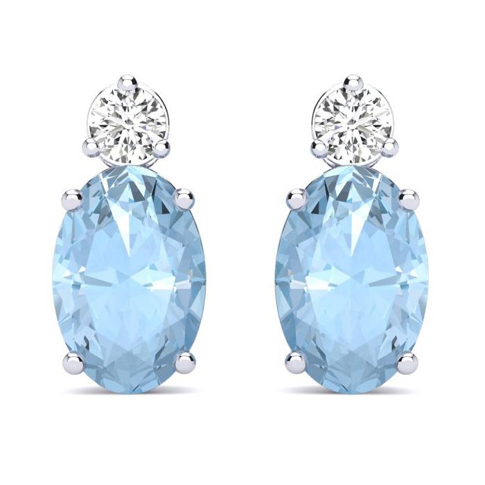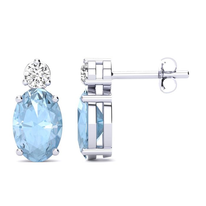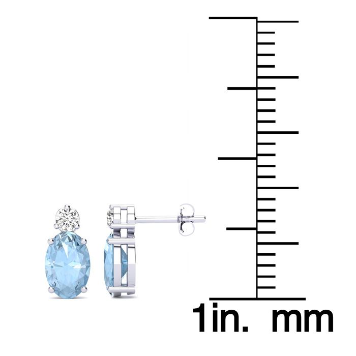 These stunning gemstone and diamond earrings feature two 6x4mm oval shape aquamarine gemstones at 0.90 carats. The gemstones are accented with two sparkling diamonds in a in I-J color, SI2-I1 clarity at 0.06 carats. Total gem weight is 0.96 carats. These earrings are crafted in 14 karat white gold and come with comfortable and secure post with friction backs.