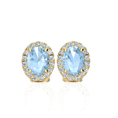 These stunning gemstone and halo diamond earrings features two 6x4mm oval shape aquamarine gemstones at 0.90 carats. They are surrounded by 44 sparkling diamonds in I-J color, I1-I2 clarity at 0.13 carats. Total gem weight is 1.03 carats. These earrings are crafted in 14 karat yellow gold and have comfortable and secure post with friction backs.