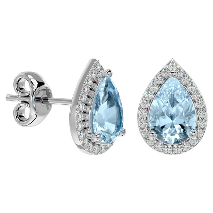 These elegant gemstone earrings feature two 9x6mm pear shape aquamarine gemstones at approximately 2 1/3 carats. They are surrounded by 48 sparkling diamonds in I-J color, I1-I2 clarity at 1/4 carat total weight. Total gem weight is approximately 2 1/2 carats. These earrings are in 14 karat white gold and have comfortable and secure friction backs. *Retrograde Birthstones™ flips the idea of traditional birthstones. Wear your ½ birthday birthstone, your Retrograde Birthstone, “The Birthstone For Your Bad Side™.