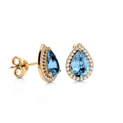These elegant gemstone earrings feature two 9x6mm pear shape aquamarine gemstones at approximately 2 1/3 carats. They are surrounded by 48 sparkling diamonds in I-J color, I1-I2 clarity at 1/4 carat total weight. Total gem weight is approximately 2 1/2 carats. These earrings are in 14 karat yellow gold and have comfortable and secure friction backs.