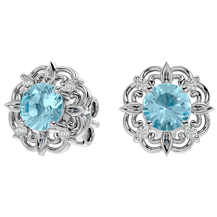 These stunning aquamarine earrings features two round shape 6x6mm aquamarine gemstones each weighing approximately 1 carat. It is surrounded by 8 sparkling diamonds in I-J color, I1-I2 clarity at 1/10 carat. Total carat weight is 2.10 carats. These earrings are crafted in sterling silver and have comfortable and secure post with friction backs. *Retrograde Birthstones™ flips the idea of traditional birthstones. Wear your ½ birthday birthstone, your Retrograde Birthstone, “The Birthstone For Your Bad Side™.