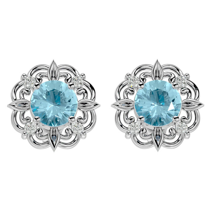 Retrograde Birthstones™ 2 Carat Aquamarine and Diamond Antique Stud Earrings In Sterling Silver
