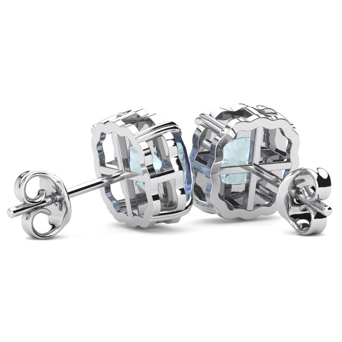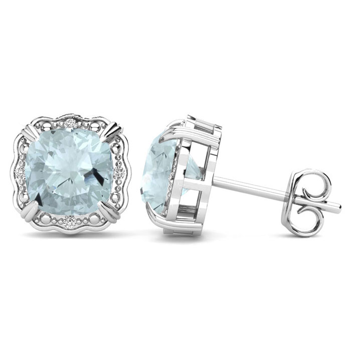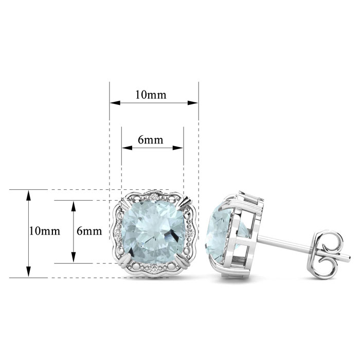 These stunning aquamarine earrings features two 6x6mm cushion shape aquamarine gemstones each weighing approximately 1 carat. It is surrounded by 8 sparkling diamonds in I-J color, I1-I2 clarity at 0.04 carats. Total carat weight is 2.04 carats. These earrings are crafted in sterling silver and have comfortable and secure post with friction backs.