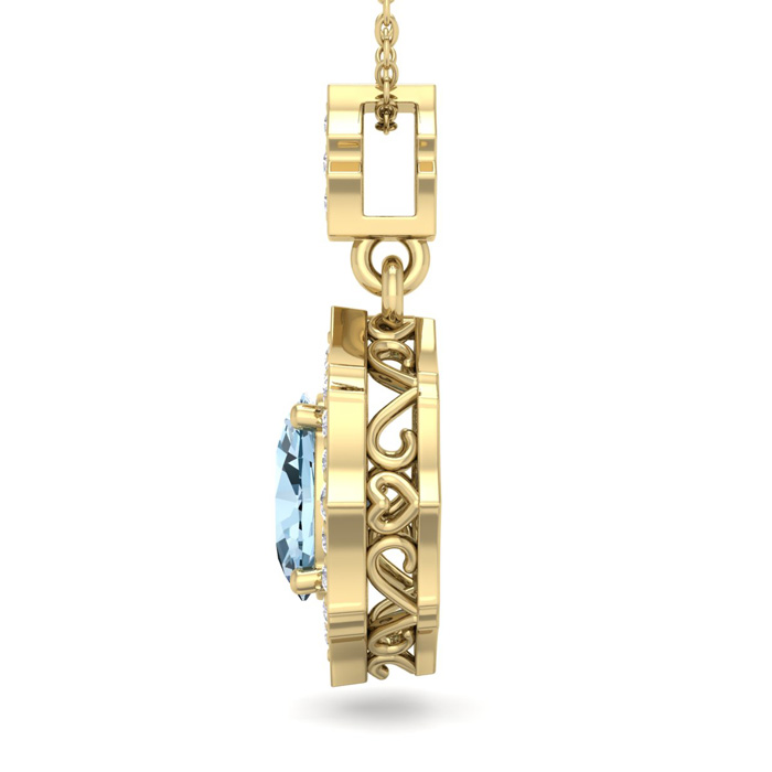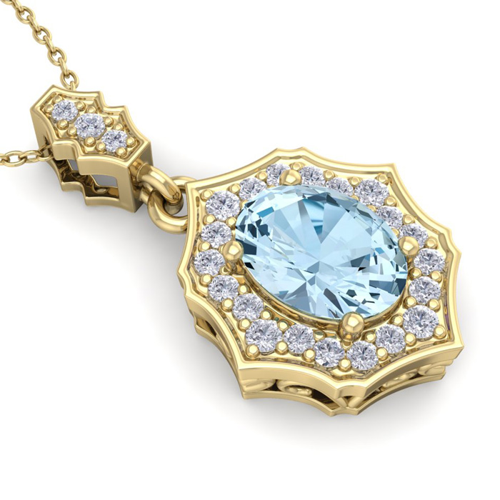 Retrograde Birthstones™ 1 1/2 Carat Oval Shape Aquamarine and Diamond Necklace In 14 Karat Yellow Gold, 18 Inches