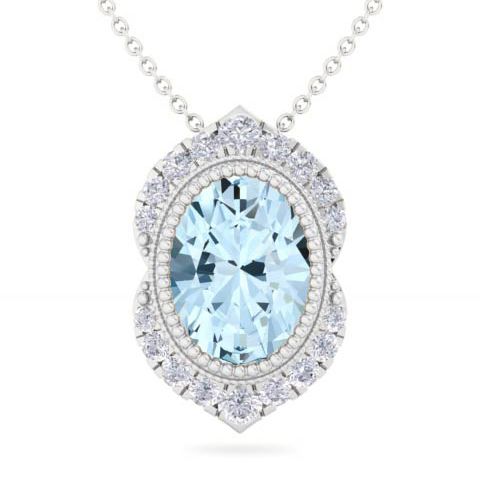 1 1/5 Carat Oval Shape Aquamarine and Diamond Necklace In 14K White Gold