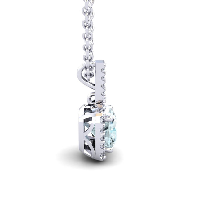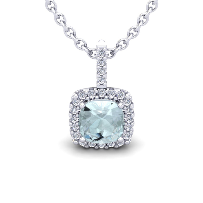 1 3/4 Carat Cushion Cut Aquamarine and Halo Diamond Necklace In 14 Karat White Gold, 18 Inches
