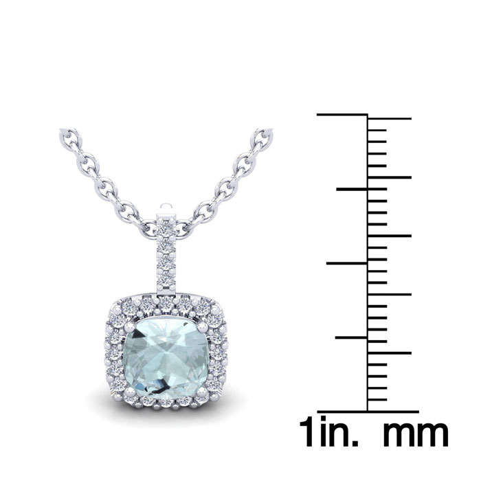 This stunning gemstone and halo diamond necklace features one 7x7mm cushion cut aquamarine gemstone at 1.61 carats. It is surrounded by 24 sparkling diamonds in a halo in I-J color, SI2-I1 clarity at 0.24 carats. Total gem weight is 1.85 carats. This necklace is crafted in 14 karat white gold and comes with an 18 inch cable chain with spring-ring clasp.