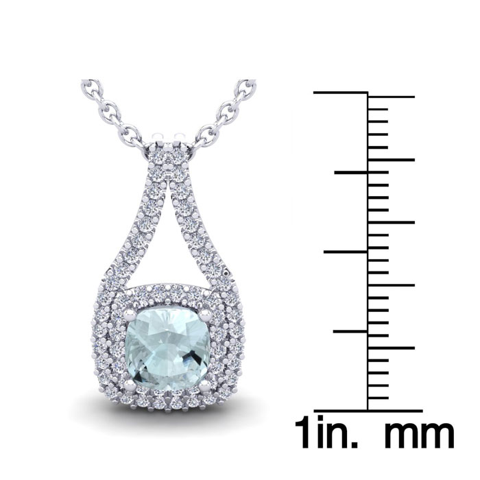 1 Carat Cushion Cut Aquamarine and Double Halo Diamond Necklace In 14 Karat White Gold, 18 Inches