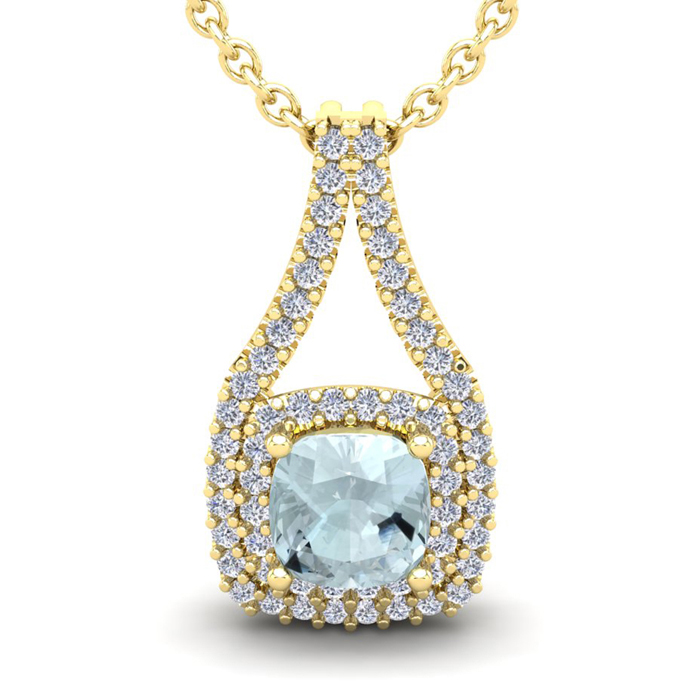 This stunning gemstone and halo diamond necklace features one 6x6mm cushion cut aquamarine gemstone at 0.72 carats. It is surrounded by 62 sparkling diamonds in a halo in I-J color, SI2-I1 clarity at 0.31 carats. Total gem weight is 1.03 carats. This necklace is crafted in 14 karat yellow gold and comes with an 18 inch cable chain with spring-ring clasp.