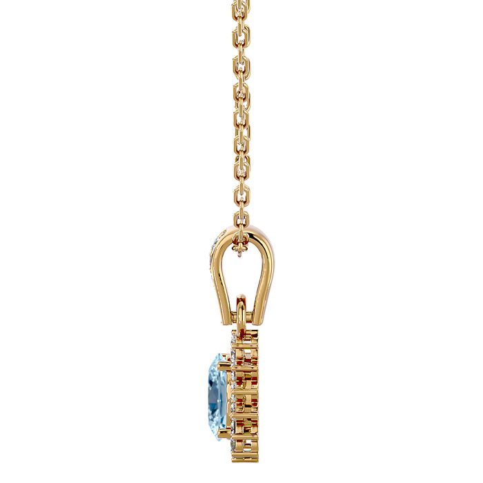 This gemstone and diamond necklace features one 7x5mm aquamarine gemstone weighing approximately 3/4 carat. There are 19 diamonds in H-I color, SI2-I1 clarity totaling approximately 1/3 carat. Total carat weight is approximately 1 carat. This necklace is in 14 karat yellow gold and comes with an 18 inch cable chain with a spring ring clasp. This pendant measures about 3/4 inch long.