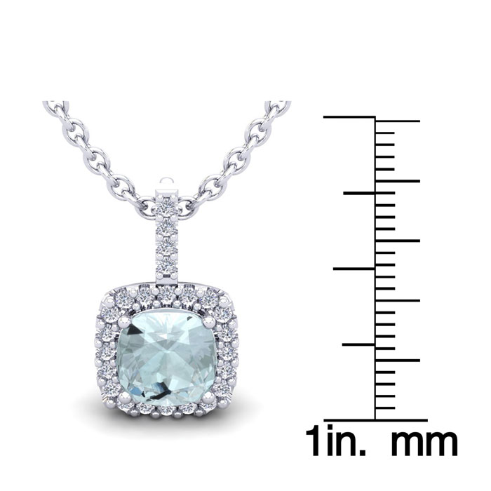 This stunning gemstone and halo diamond necklace features one 8x8mm cushion cut aquamarine gemstone at 2.10 carats. It is surrounded by 24 sparkling diamonds in a halo in I-J color, SI2-I1 clarity at 0.30 carats. Total gem weight is 2.40 carats. This necklace is crafted in 14 karat white gold and comes with an 18 inch cable chain with spring-ring clasp.