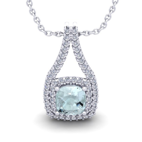 This stunning gemstone and halo diamond necklace features one 7x7mm cushion cut aquamarine gemstone at 1.61 carats. It is surrounded by 58 sparkling diamonds in a halo in I-J color, SI2-I1 clarity at 0.58 carats. Total gem weight is 2.19 carats. This necklace is crafted in 14 karat white gold and comes with an 18 inch cable chain with spring-ring clasp.