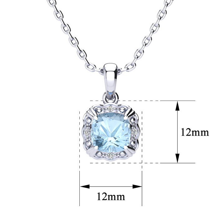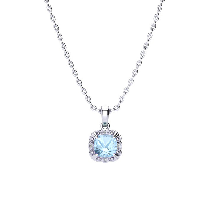 This stunning aquamarine necklace features one 8x8mm cushion shape aquamarine gemstone weighing approximately 2 carats. It is surrounded by 4 sparkling diamonds in I-J color, I1-I2 clarity at 0.04 carats. This necklace is crafted in sterling silver and comes with an 18 inch cable chain with spring ring clasp.