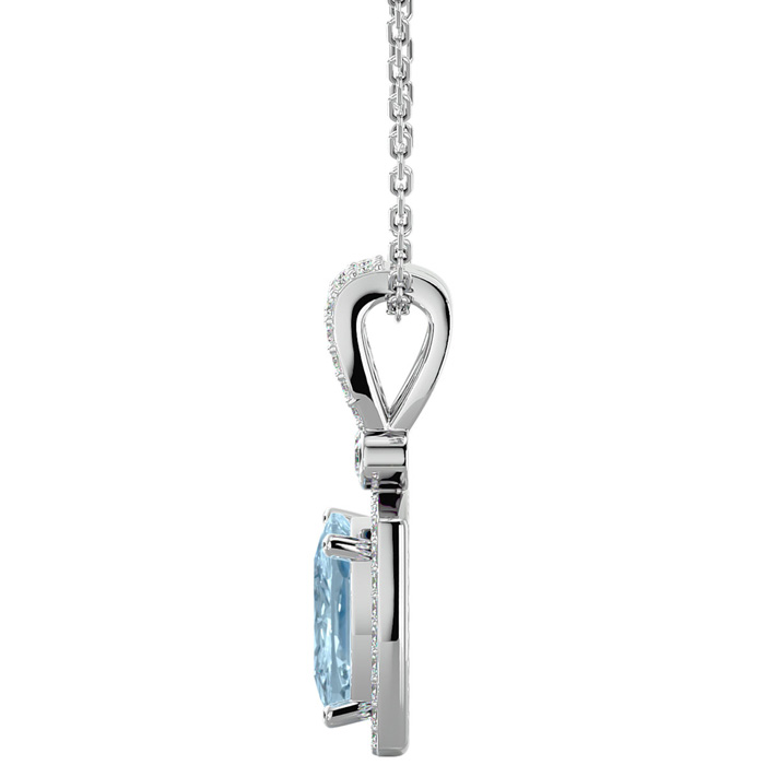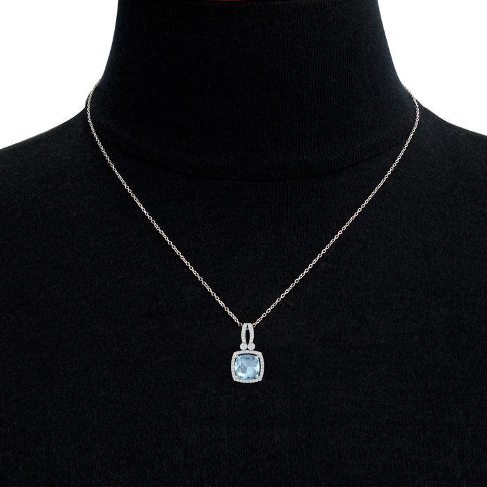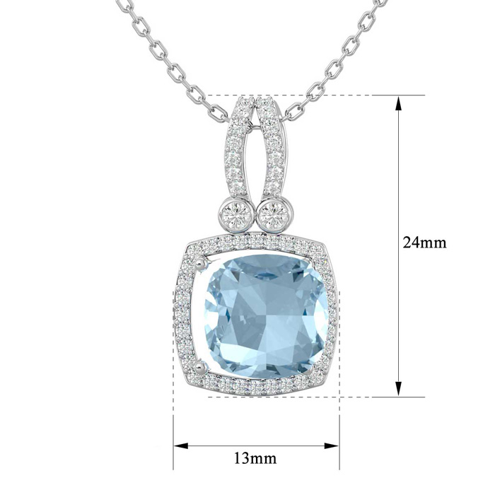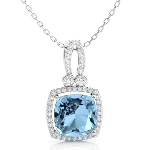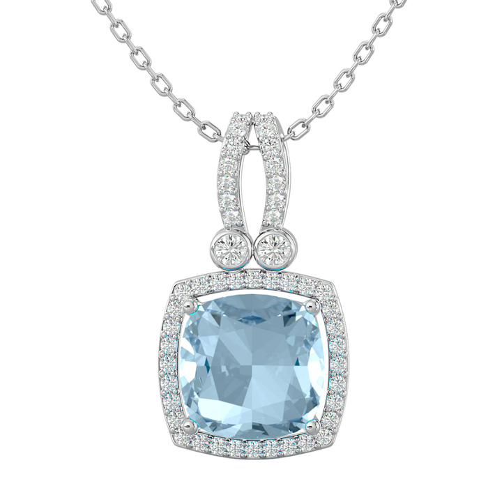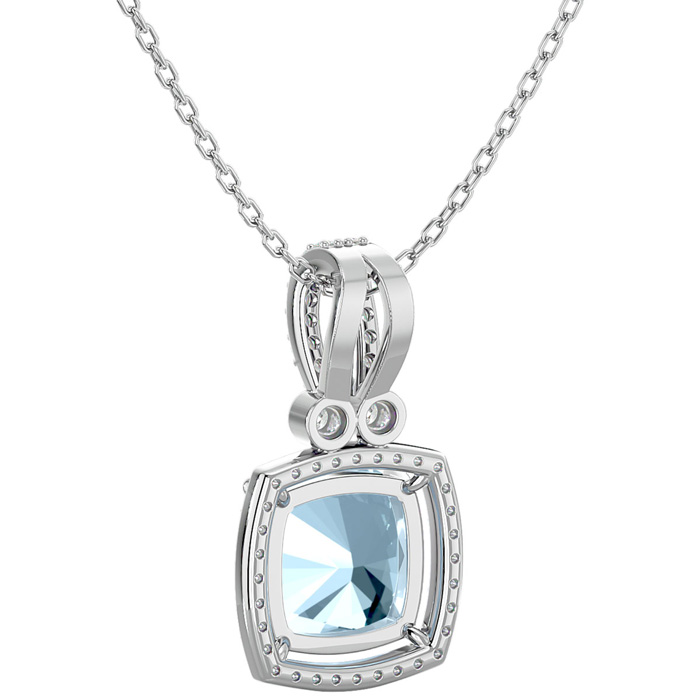 3 Carat Cushion Cut Aquamarine and Halo Diamond Necklace In 14 Karat White Gold, 18 Inches