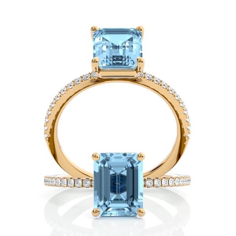 This stunning gemstone and diamond ring features one 8x6mm emerald shape aquamarine gemstone at 1.40 carats. It is surrounded by 22 sparkling diamonds along the band in I-J color, I1-I2 clarity at 0.18 carats. Total gem weight is 1.58 carats. This ring is crafted in 14 karat yellow gold.