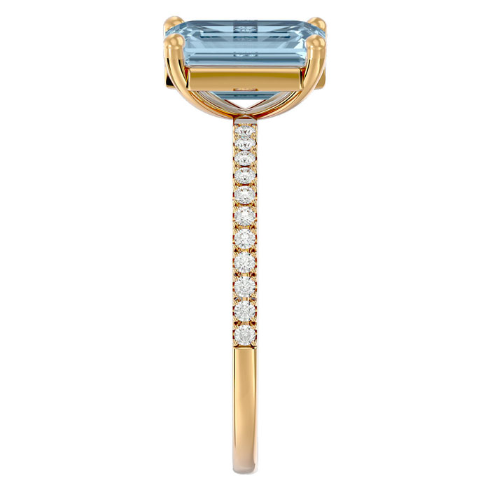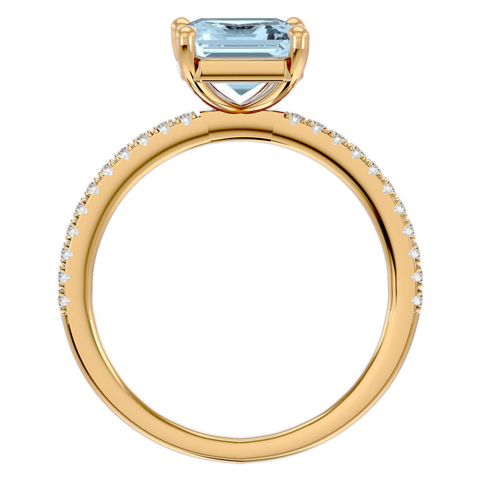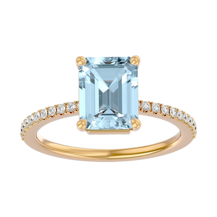 This stunning gemstone and diamond ring features one 8x6mm emerald shape aquamarine gemstone at 1.40 carats. It is surrounded by 22 sparkling diamonds along the band in I-J color, I1-I2 clarity at 0.18 carats. Total gem weight is 1.58 carats. This ring is crafted in 14 karat yellow gold.