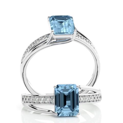 This elegant gemstone ring features one 8x6mm emerald shape aquamarine gemstone at approximately 1.40 carats. It is surrounded by 14 sparkling diamonds in I-J color, I1-I2 clarity at 1/5 carat total weight. Total gem weight is approximately 1 1/2 carats. This ring is in 14 karat white gold.