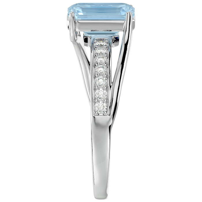 This elegant gemstone ring features one 8x6mm emerald shape aquamarine gemstone at approximately 1.40 carats. It is surrounded by 14 sparkling diamonds in I-J color, I1-I2 clarity at 1/5 carat total weight. Total gem weight is approximately 1 1/2 carats. This ring is in 14 karat white gold.