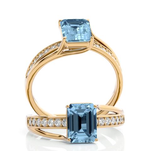 This elegant gemstone ring features one 8x6mm emerald shape aquamarine gemstone at approximately 1.40 carats. It is surrounded by 14 sparkling diamonds in I-J color, I1-I2 clarity at 1/5 carat total weight. Total gem weight is approximately 1 1/2 carats. This ring is in 14 karat yellow gold.