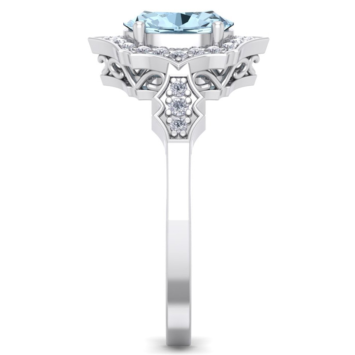 This elegant gemstone ring features one 8x6mm oval shape aquamarine gemstone at approximately 1.15 carats. It is surrounded by 26 sparkling diamonds in I-J color, I1-I2 clarity at 1/4 carat total weight. Total gem weight is approximately 1.40 carat total weight. This ring is in 14 karat white gold.